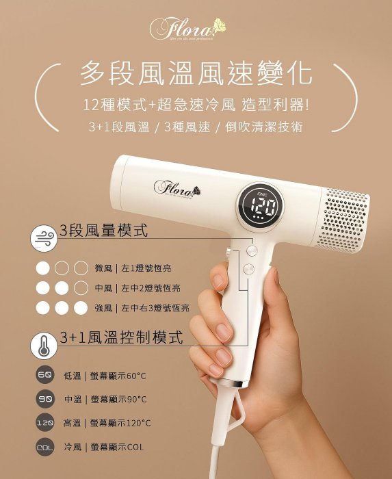 四擋風溫(冷風-60度-90度-120度-)四段溫度,12種模式