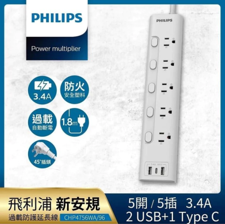 PHILIPS飛利浦 新安規 5開5插 3.4A 2USB+Type C 過載防護型延長線1.8米 CHP4756