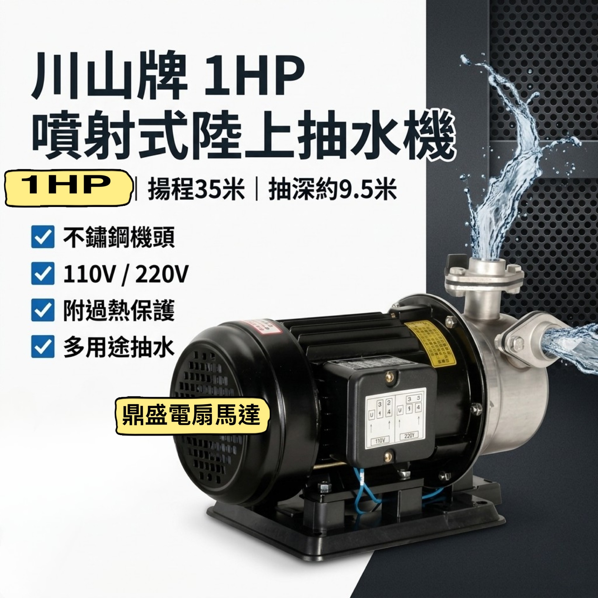 「川山」白鐵噴射式抽水馬達 溪水抽水機 高揚程70米 川山牌 1HP 1″ .抽井水適用.高噴射抽水 (台灣製造)