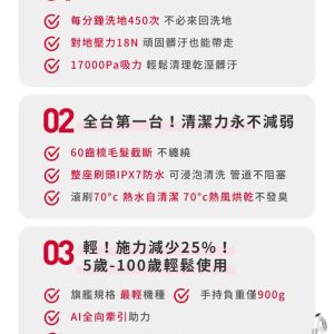 • 「自清潔」與「洗拖吸三合一」強調科技與便利。