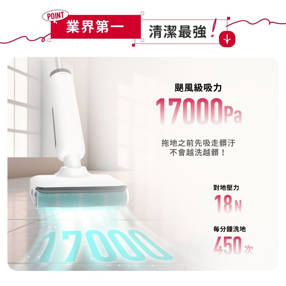 吸力達到17000Pa,拖地之前先吸走髒污 不會越洗越髒對地壓力18N,
